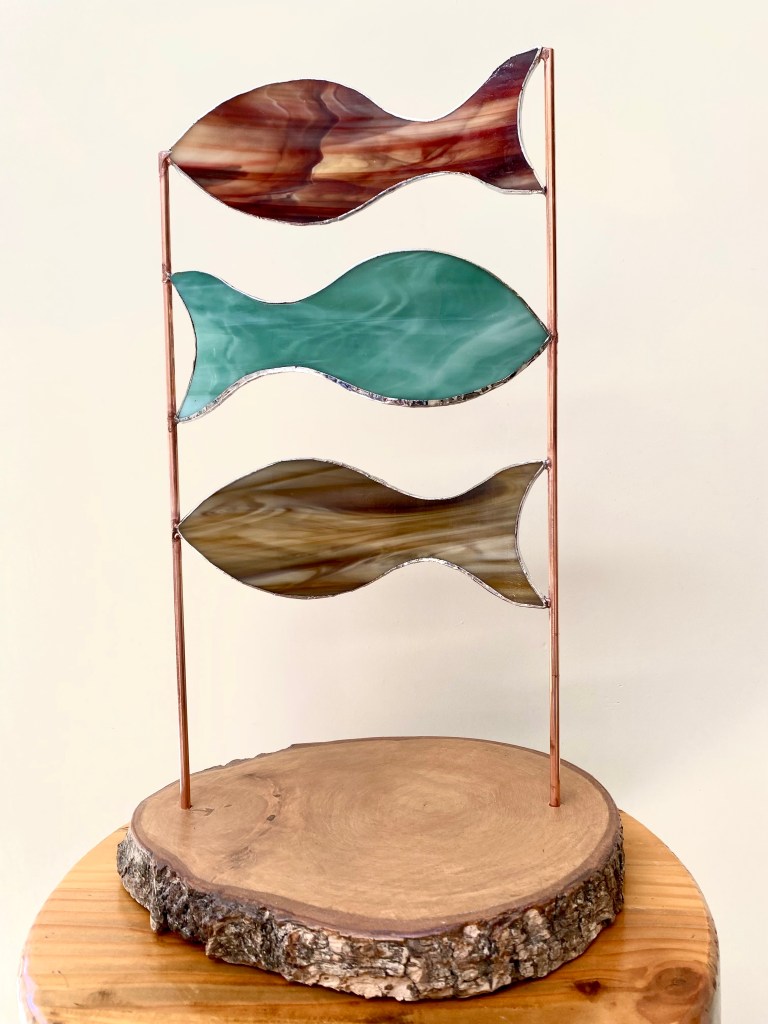 Patterned and curved stained glass fish fixed to copper rods, set on a varnished wooden tree slice.