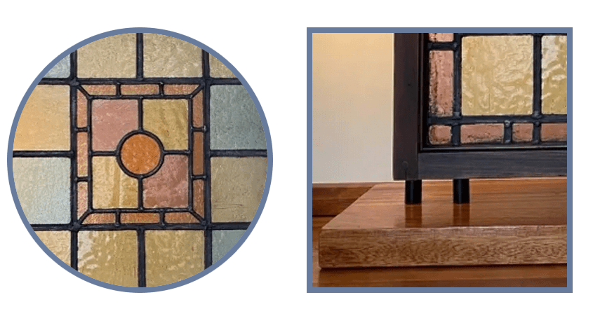 Restored antique glass window set on an Iroko wooden base
